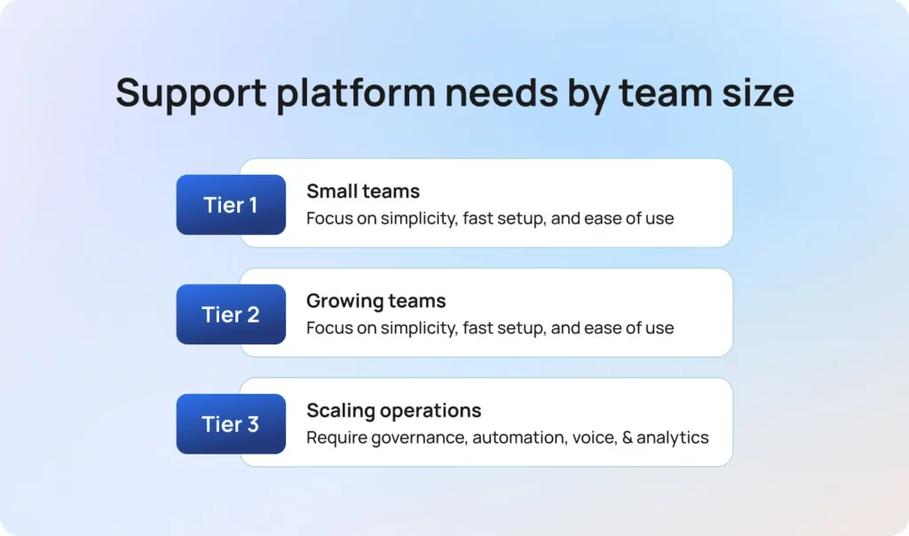 Tier 2 teams, often ten to thirty agents, begin to feel the weight of scale. Workflows, SLAs, reporting, and self-service infrastructure start to matter because consistency becomes harder to maintain without structure.