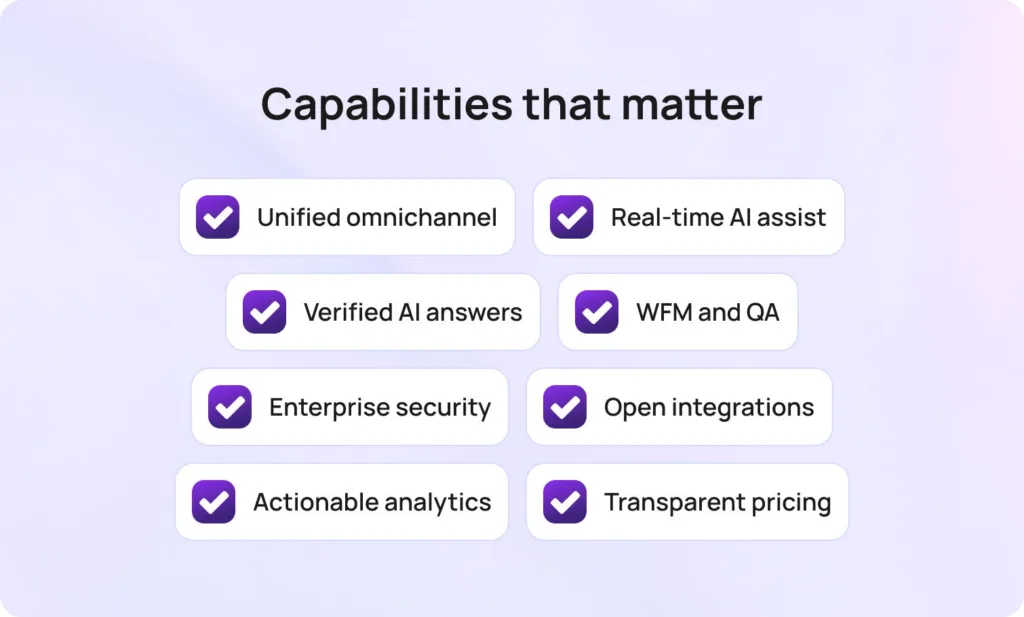 Teams searching for Nextiva alternatives typically need to grow beyond unified communications into omnichannel contact center operations. The best alternatives to Nextiva offer voice, chat, email, and social in one platform, AI-powered features grounded in a knowledge base, integrated workforce management and quality assurance, and transparent pricing.
