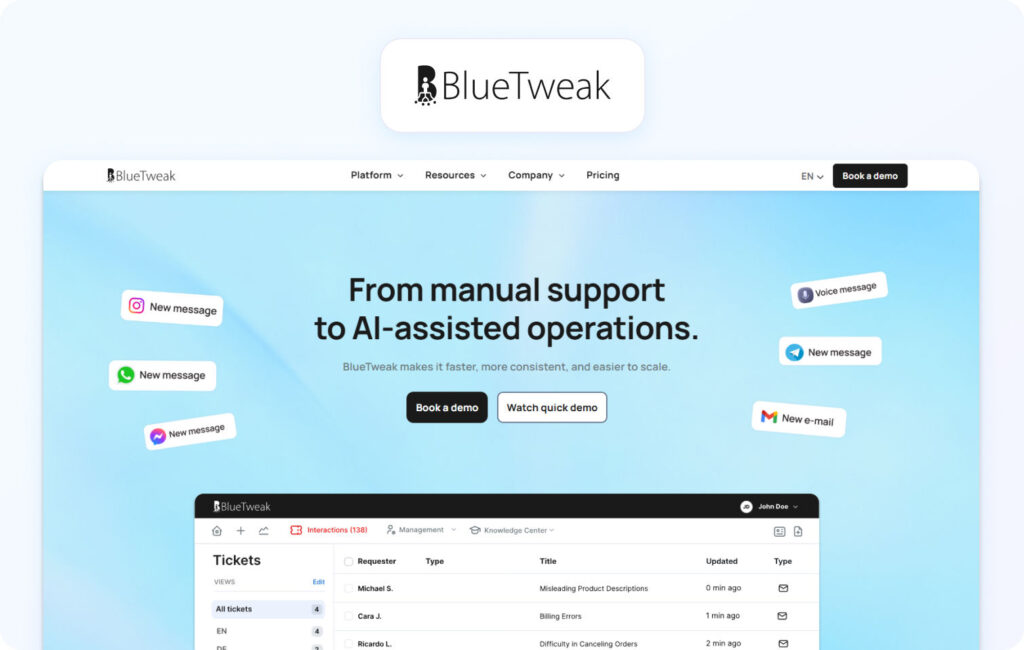 BlueTweak is an AI Customer Support Platform that unifies every conversation, customer record, and automation into one workspace.